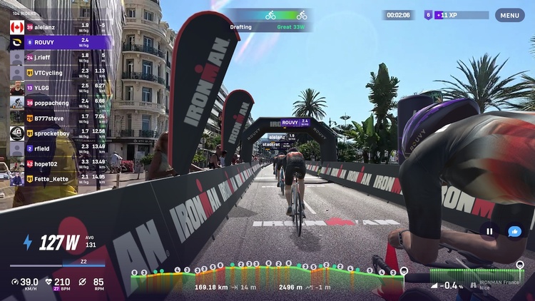 Und was beim Training draußen auf der Straße immer wieder für Schreckmomente und Adrenalinschübe sorgt, ist in der virtuellen Welt von Rouvy höchstens angenehmer Nervenkitzel: Da kann es schon mal vorkommen, dass einem beim Herausfahren aus einem dunklen Tunnel ein breites Wohnmobil entgegenkommt, was den Realitätsgrad der Animation natürlich verstärkt. Von beeindruckender Detailgenauigkeit sind auch die Hotelgebäude an der Strandpromenade von Nizza – so kommt beim Indoor-Training echtes Mittelmeer-Feling auf.