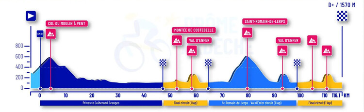 Die Belgierin Margot Vanpachtebeke nutzte die folgende Flaute zur Attacke. Die wurde an der Côte de Saint-Romain-de-Lerps mit noch 43 zu fahrenden Kilometern wieder vereitelt. Femke de Vries und Paulina Rooijakkers erhöhten die Schlagzahl für die Niederlande. Sie brachten das auf 19 Fahrerinnen reduzierte Feld, unter denen auch Koch und Niedermaier waren, zurück. Als Vollering 39 Kilometer vor dem Ziel angriff, konnten van der Breggen, Elisa Longo Borghini (Italien) und Niewiadoma-Phinney folgen, zu Koch und Garcia klaffte eine Lücke.