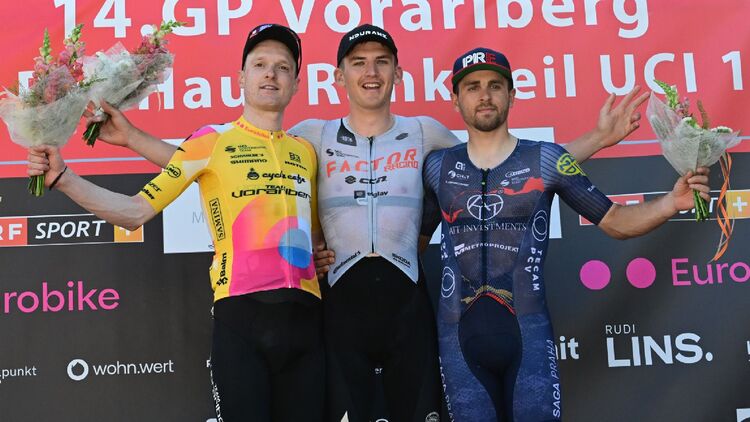 In Vorarlberg auf dem Podest: Colin Stüssi (links). Auch Sieger Jaka Marolt (Mitte) und der Dritte Marcin Budzinski (rechts) strahlen. | Foto: Reinhard Eisenbauer