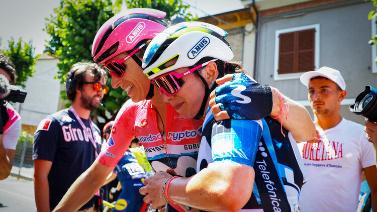 Marlen Reusser (links) im Rosa Trikot des Giro d'Italia gratuliert ihrer Teamkollegin Liane Lippert zum Sieg auf der 6. Etappe. | Foto: Cor Vos